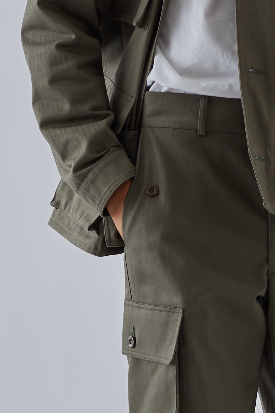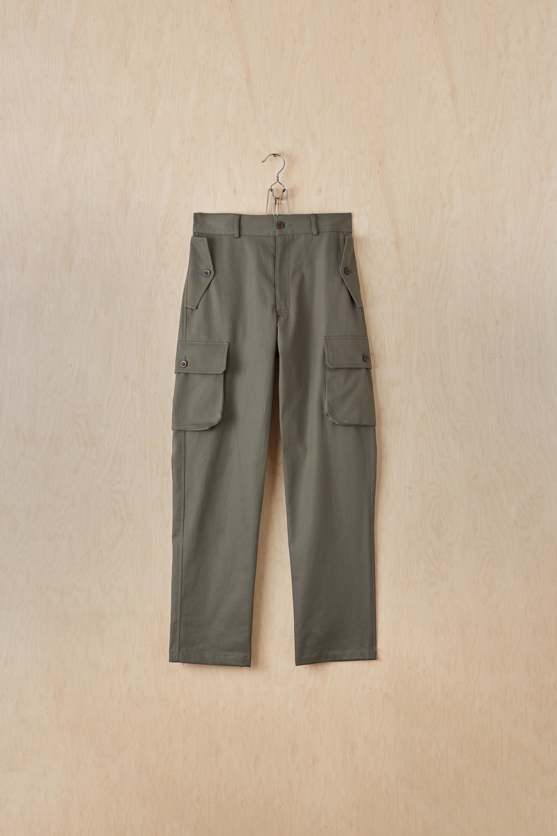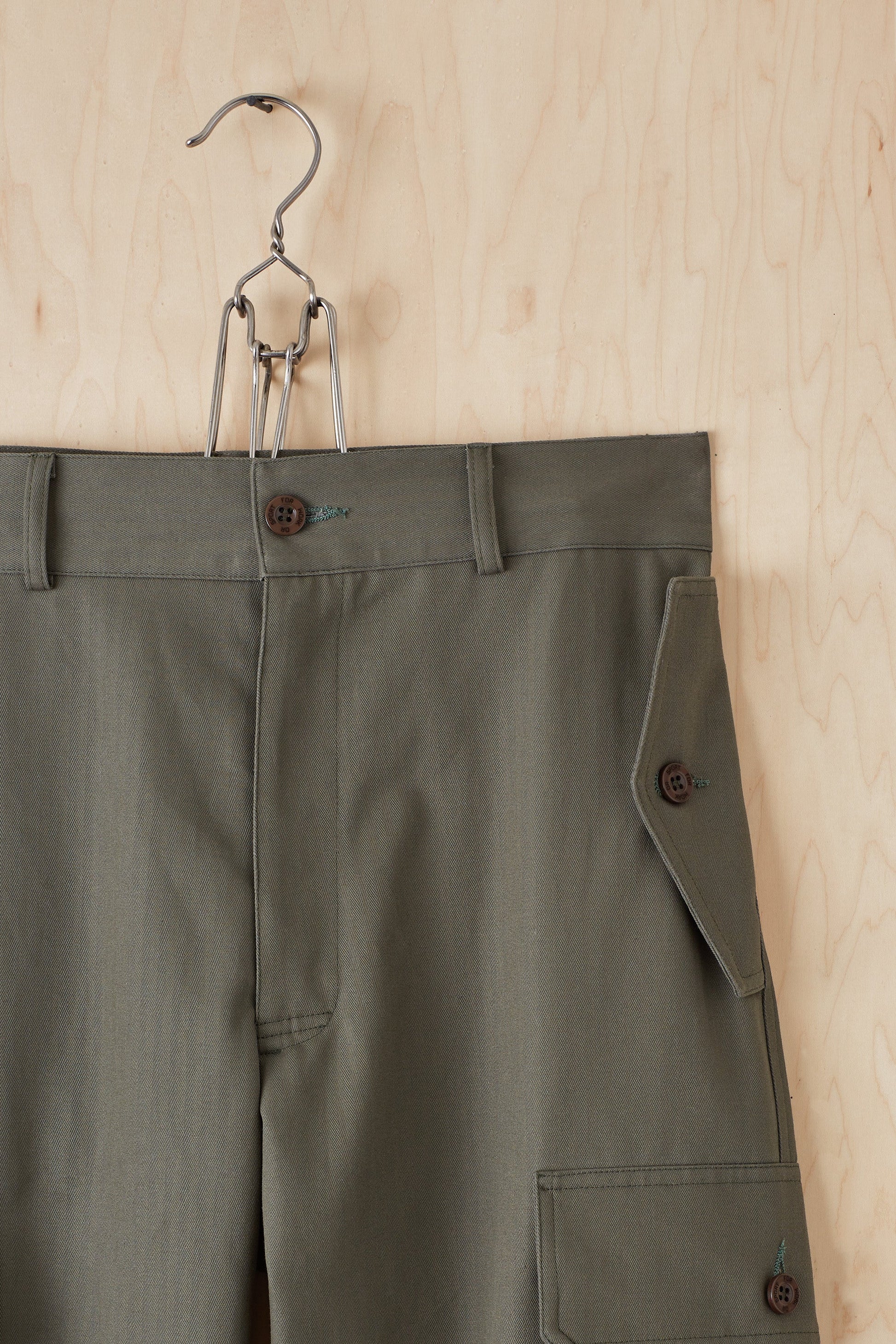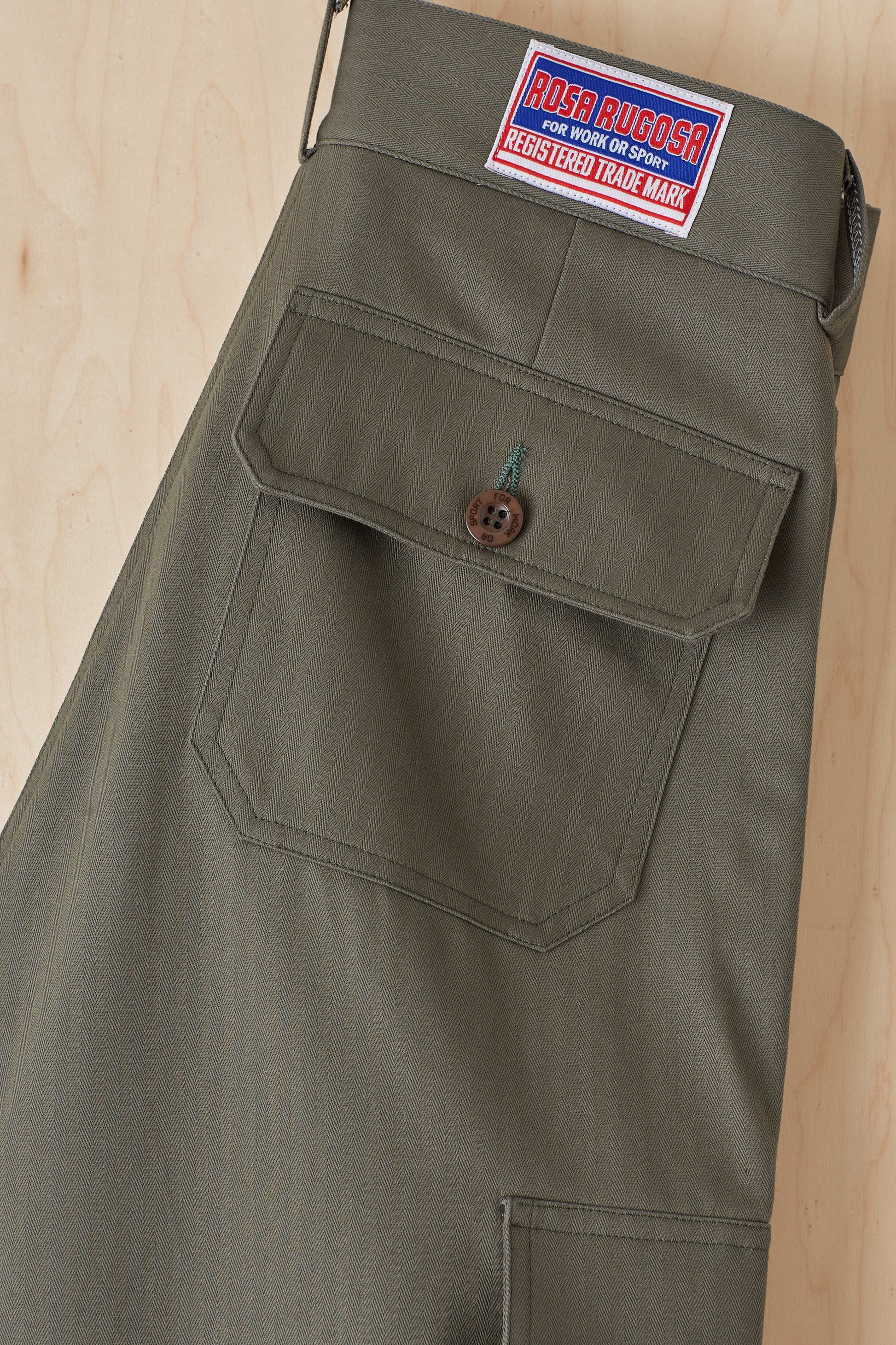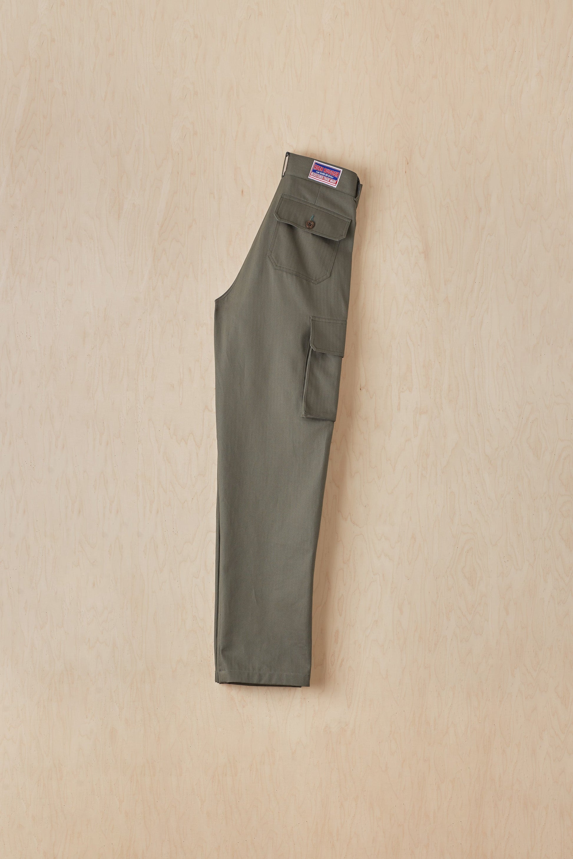Available in 10 oz herringbone, 100% cotton. Double needle topstitch. Two gusseted cargo pockets, two diagonal side seam and two back pockets. Branded resin button fly closure. Woven label at rear. Machine wash cold / tumble dry low.